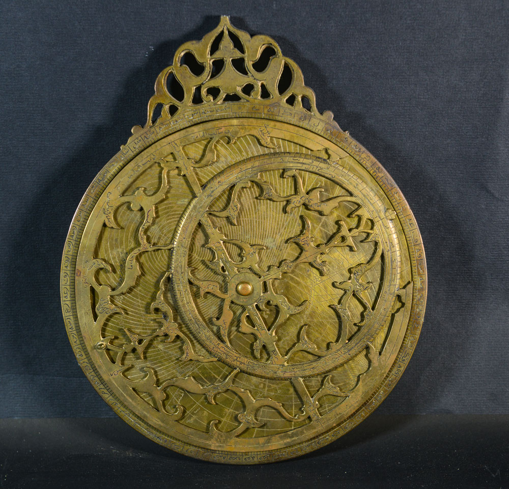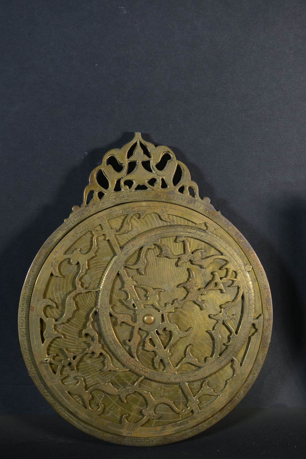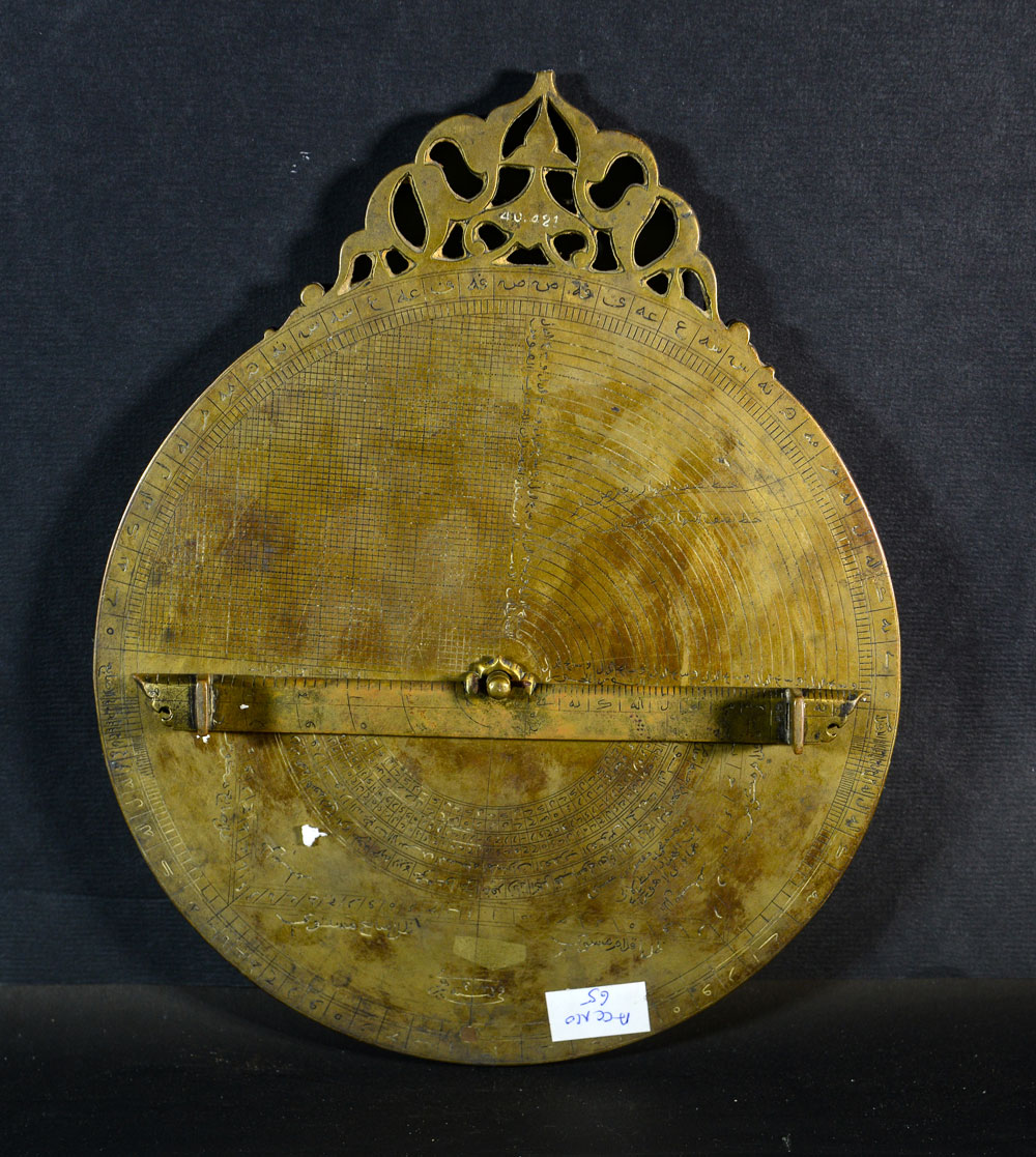 This Brass Astrolabe, made by Muhammad Muqim during the reign of Jahangir (1605-1627) as it is inscribed, is a portable pocket-size device. Astrolabes have various applications ranging from the astrological, the astronomical, and the religious to seasonal and daily timekeeping and tide tables.