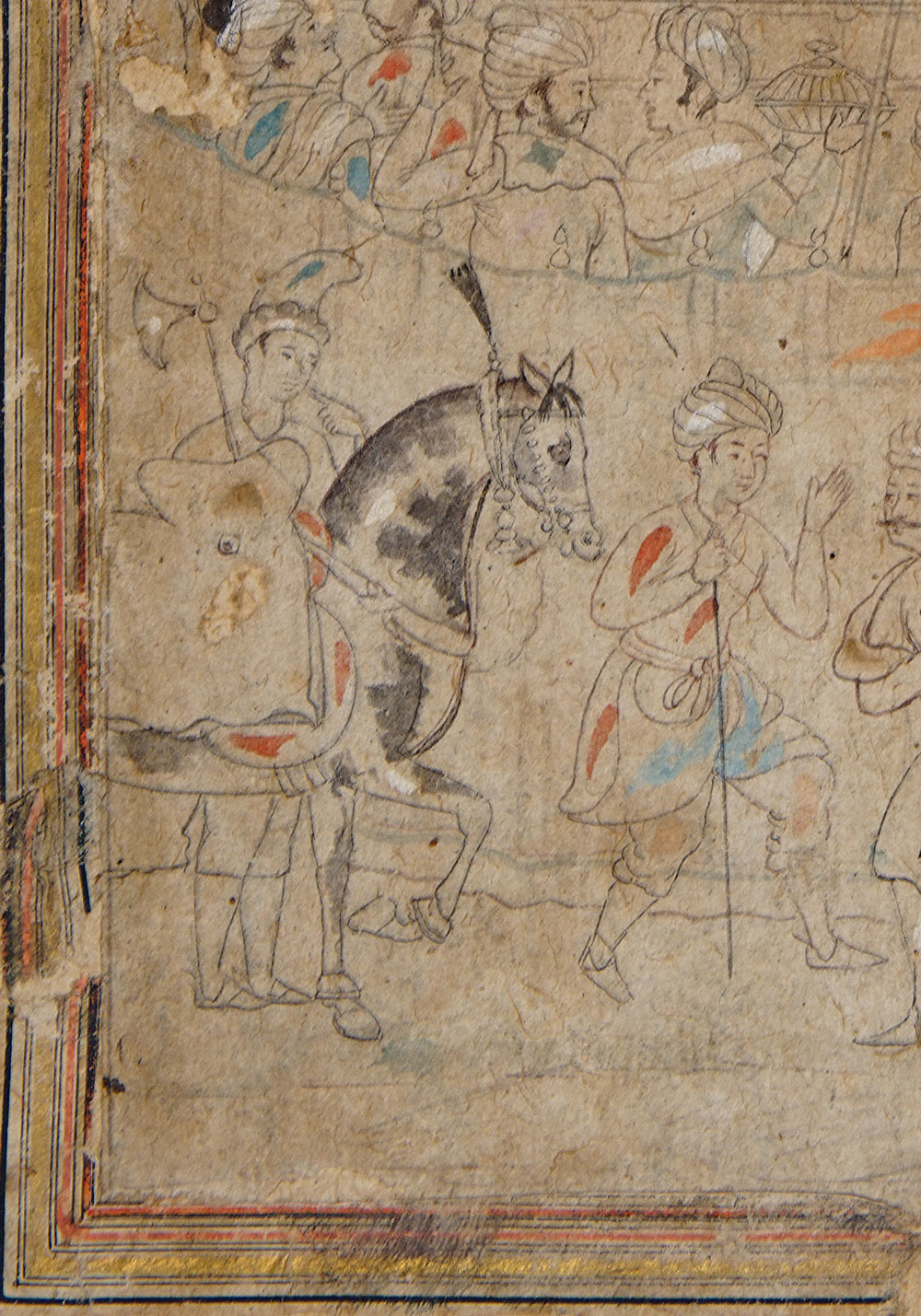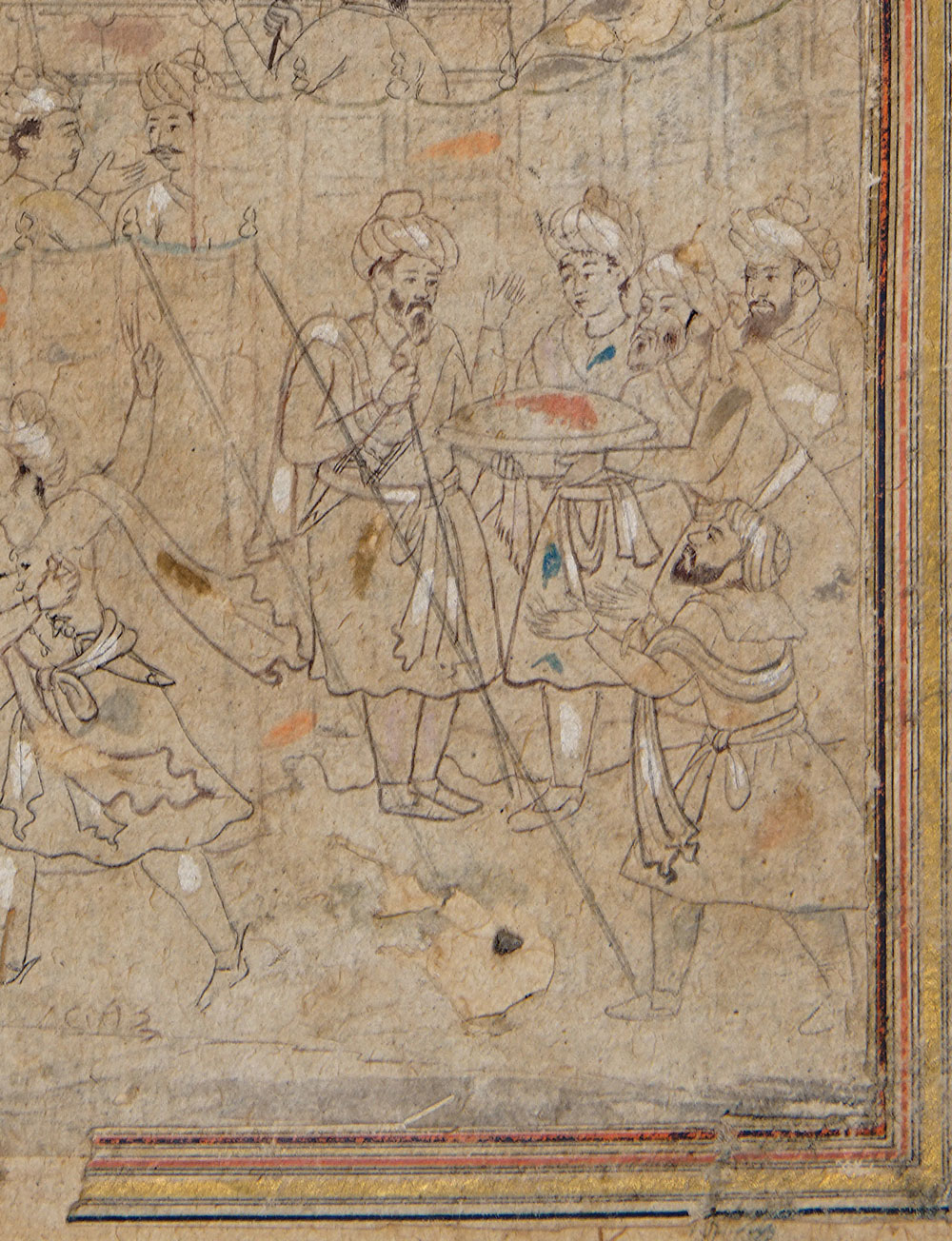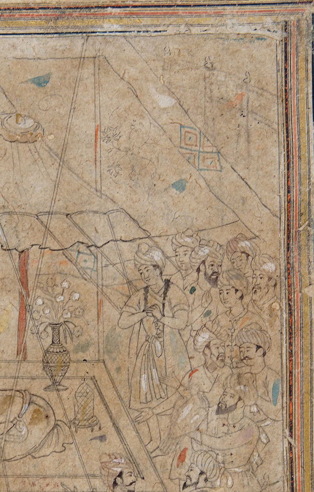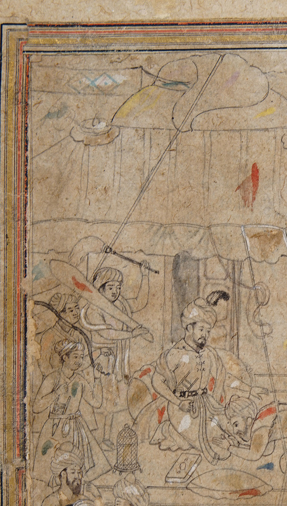 This rare unfinished painting depicts a Mughal emperor in an encampment. For each miniature, several artists worked on different components, here the faces are seemingly done by a different hand. The colours to use on the turbans, clothes and even the serving dishes are indicated, giving an insight on the creation of a miniature painting.