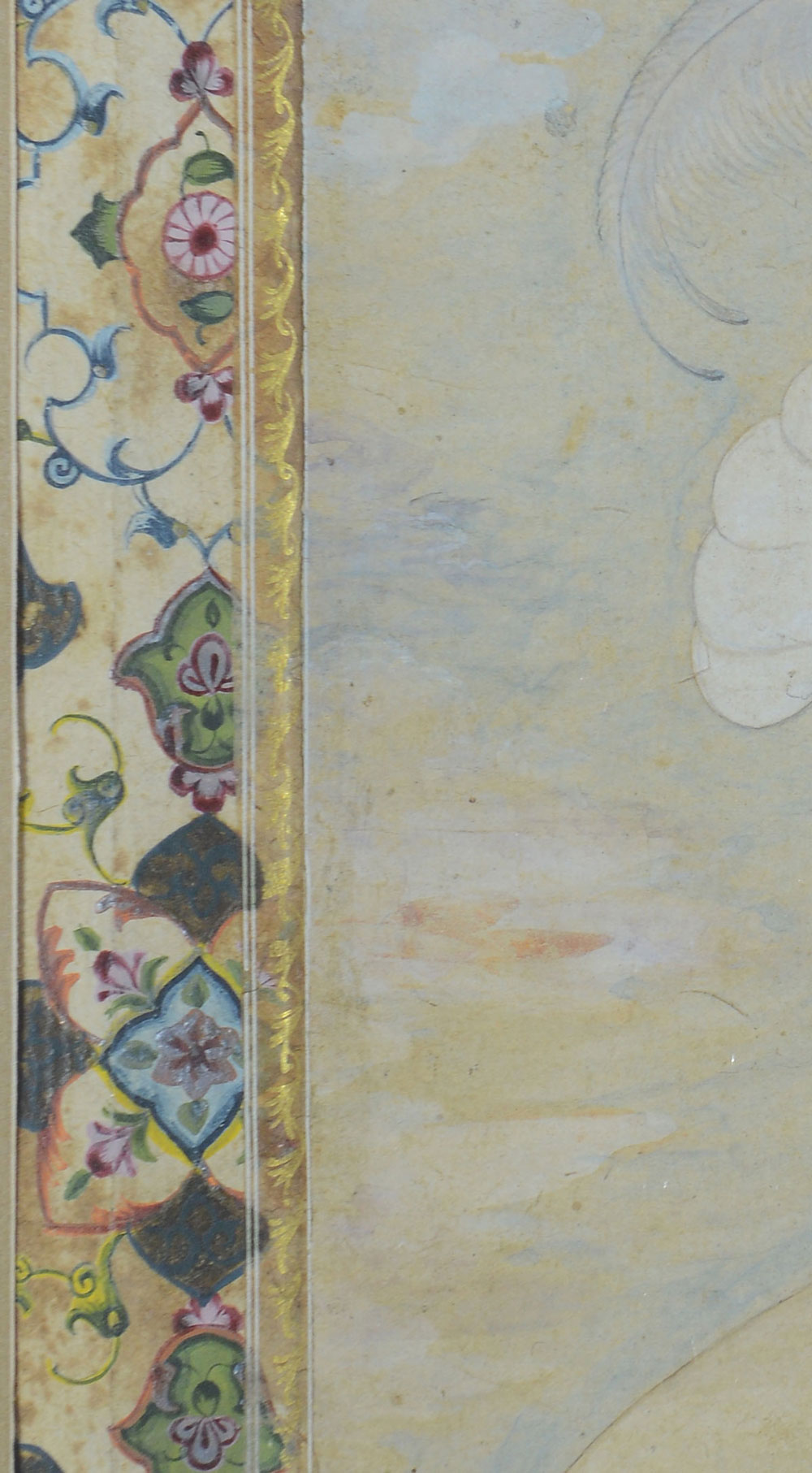 A great innovation in Mughal painting was the introduction of realistic portraiture, with the face in profile from Shah Jahan’s time onwards. Emperor Akbar himself ‘sat for his likeness, and also ordered to have likenesses of all the grandees of the realm’. Jahangir continued Akbar’s practice of collecting portraits of court personalities. Here, Sher Afghan Khan, Jahangir’s jaghirdar and first husband of his later wife, Nur Jahan, is shown in an unusual portrait limited to his bust. He is simply attired, holds a flower in one hand and a jewel in the other.