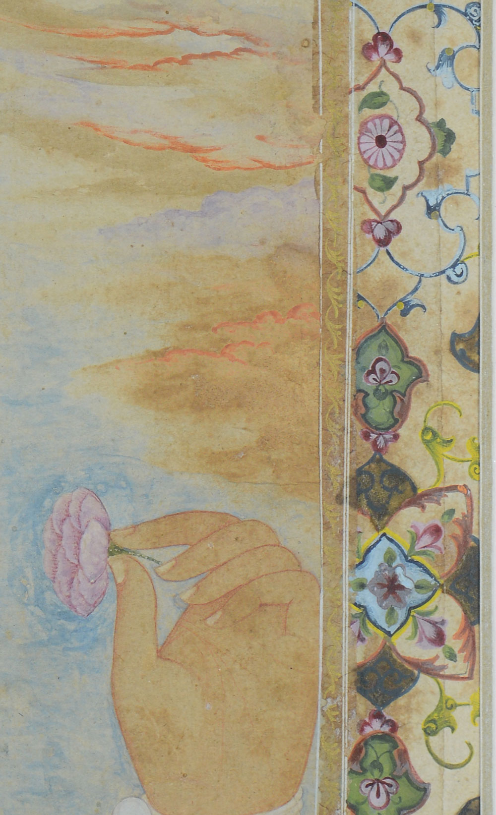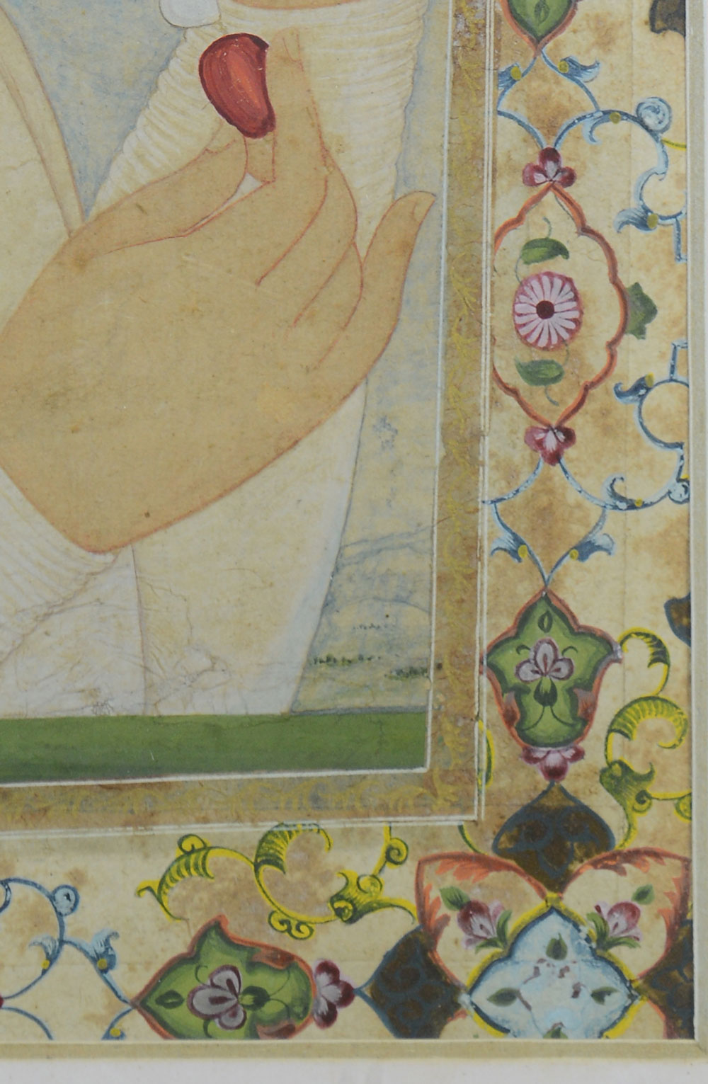 For the emperors however, a true likeness was not always the preference. During Akbar’s reign, one notes an undeniable realism in his portraits. However, during Jahangir’s and Shah Jahan’s era, realism was replaced with a more formalized style that projected a model or ideal emperor. More formal compositions, much like this painting, of the subject in a profile view holding a flower or jewel, emerged. Paintings with figures in larger and busier scenes made way for paintings which focused on one individual rendered with impeccable precision and realism. Technical mastery was supplemented with an acute psychological understanding. The best portrait painters were those that presented sensitive and expressive portraits.